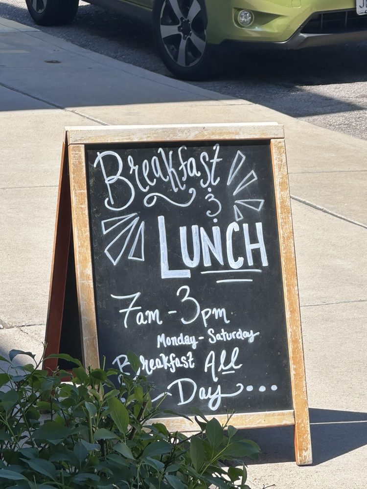 Two eggs, homestyle potatoes, choice of bread, and choice of one side: two bacon slices or a sausage patty or roasted veggies